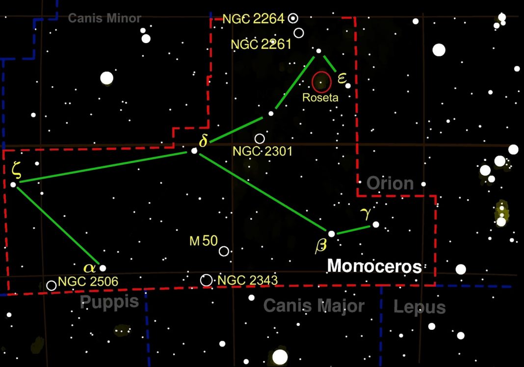 Nebuloasa Rozeta poate fi vazuta cu telescopul sau cu un binoclu mare. Aceasta nebuloasa este destul de slab iluminata, desi are o magnitudine combinata de 5, iar pentru a putea fi observata, cerul trebuie sa fie lipsit de Luna. NGC 2244 este un roi de stele implicat intr-o nebuloasa de reflectie ce se intinde pe 55 de ani lumina si este numita “Rozeta”. Situat la aproximativ 2500 de ani lumina distanta, clusterul incalzeste gazul din interiorul nebuloasei pana la aproape 10 000 de grade Celsius, determinand-o sa emita lumina intr-un proces similar cu cel al unui tub fluorescent. Un mare procent din aceasta lumina este hidrogen-alfa, care este dispersat inapoi din invelisul sau de praf si devine polarizat.