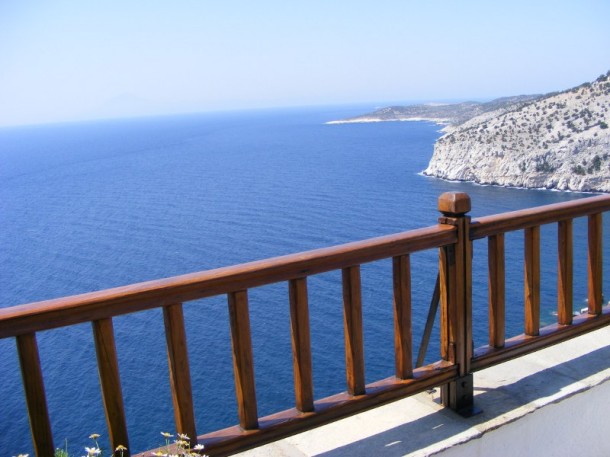 Dar revenind la mănăstirea în sine, ai senzaţia că ai descoperit grădina raiului. Mănăstirea Sfântul Arhanghel Mihail este construită chiar pe vârful unei stânci, deasupra Mării Egee. Terasa este împrejmuită cu gard de lemn şi tufe de leandri în toate culorile. Mănăstirea este condusă de maici, iar atmosfera este foarte primitoare. Biserica veche este în lucrări ample de restaurare şi extindere, aşa că în anul în care am fost noi acolo, 2011, nu putea fi vizitată.