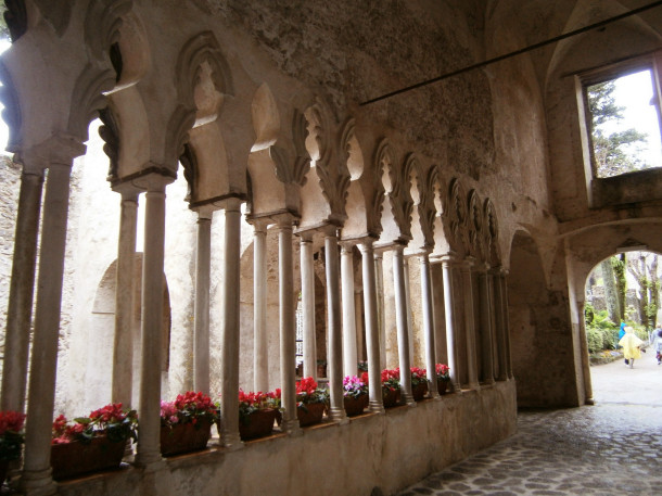 La stilul original al Villei, care îmbină arhitectura maură, siciliană şi normandă, s-au adăugat, ulterior, alte elemente, cum ar fi cele caracteristice secolului al XVIII-lea şi al XIX-lea. Intrarea este păzită de un turn cu rol pur decorativ. Mergând în continuare pe alee, se iveşte o curte frumoasă, în stil maur, mărginită de coloane zvelte, cu modele elegante, împodobită cu mici ghivece cu flori. Turnul principal al vilei, cunoscut sub numele de Torre Maggiore, are o înălţime de 30 de metri şi era folosit pentru a observa vapoarele piraţilor care veneau spre coasta Amalfi. Terasa superioară este orientată spre răsărit şi oferă un punct superb de panoramă. Partea mea preferată din întreg domeniul a fost grădina cu vedere spre Golful Salerno, pe care am admirat-o scăldată în ceaţă. Ploaia şi norii au creat un aer misterios în întreg domeniul, iar cerul parcă se contopea cu marea, îmbrăţişând întreaga coastă.