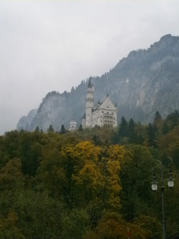 Castelul Neuschwanstein este situat în vecinătatea localităţii Fussen, aflată în sud-vestul Germaniei, foarte aproape de graniţa cu Austria. Din Munchen, am luat un tren până la Fussen şi apoi un autobuz spre Schwangau, satul lângă care se află castelul. L-am zărit de cum am coborât din autobuz, cocoţat la o înălţime considerabilă şi învăluit într-o ceaţă fină, înconjurat de păduri verzi. Dimineaţa era destul de frig, aşa că m-am aşteptat la ploaie, însă am sperat că nu va fi atât de puternică încât să-mi strice cheful de plimbărit. Am avut noroc şi au fost doar câteva picături mărunte, insistente, ce-i drept, dar care nu m-au deranjat prea tare.