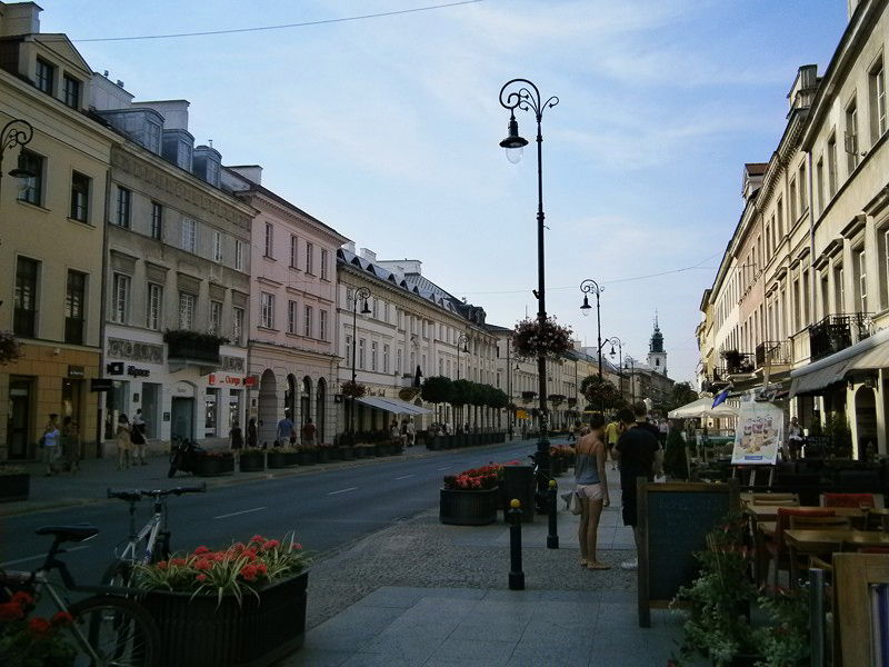 Prima dată când am ajuns pe strada Nowy Swiat sau Noua Lume, am avut impresia că mă aflu undeva în Franţa, într-un orăşel cochet unde poţi să leneveşti la umbră, cu o ceaşcă de cafea şi un croissant în faţă, în timp ce-ţi faci planuri de vacanţă. Mărginită de clădiri renovate şi împodobită cu flori şi copaci, Nowy Swiat este un du-te-vino continuu de turişti şi localnici. Sunt multe restaurante şi magazine, iar la terase sunt în vogă şezlongurile comode. Trec chiar şi autobuze, însă traficul este foarte lejer, iar şoferii răbdători.